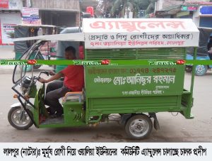সম্প্রতি লালপুর উপজেলার প্রত্যন্ত অঞ্চলের মুর্মূষ রোগীদের ৫০ টাকার বিনিয়ে দ্রুত সেবা প্রদান ও উপজেলা স্বাস্থ্য কমপ্লেক্সে পৌছে দেওয়ার লক্ষে ২০১৫-১৬অর্থ বছরের দ্বিতীয় লোকাল গভর্ন্যান্স সাপোর্ট প্রজেক্ট (এলজিএসপি-২) প্রকল্পের অর্থায়নে প্রতিটি অ্যাম্বুলেন্সে ২লাখ ১০হাজার টাকা ব্যয় করে রিচার্জেবল ইজিবাইক দিয়ে রোগী বহনের উপযোগী করে তৈরী এসব অ্যাম্বুলেন্স নাটোরের লালপুর উপজেলার ১০ ইউনিয়নের ১ টি করে কমিউনিটি অ্যাম্বুলেন্স ও চালককে মোবাইল ফোন প্রদান করা হয়। যা ইতিমধ্যে জনগনে ব্যাপক সারা জাগিয়েছে।